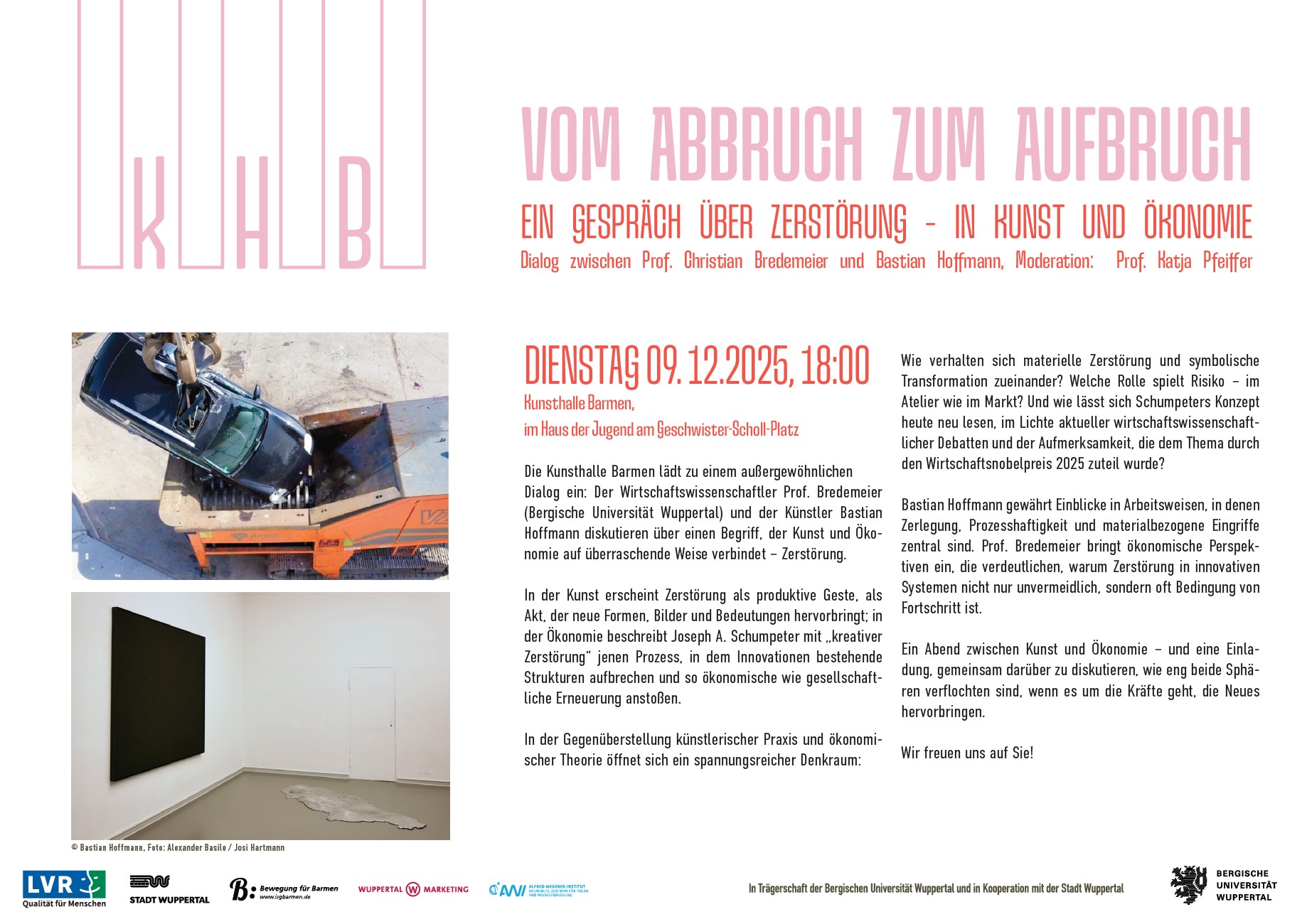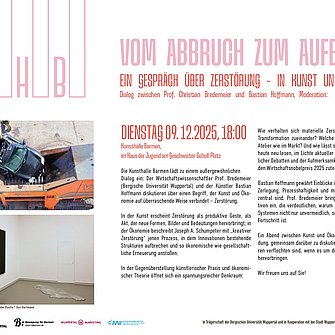 Am 09.12.2025 um 18 Uhr diskutieren Prof. Christian Bredemeier und der Künstler Bastian Hoffmann in der Kunsthalle Barmen über das Zusammenspiel von materieller Zerstörung, künstlerischer Praxis und ökonomischen Perspektiven.